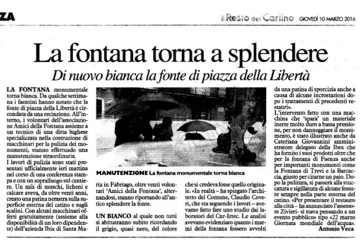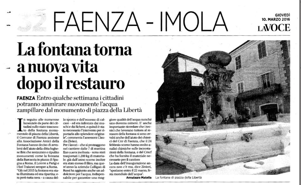 Ampia risonanza nei media locali per la presentazione dell'opera di pulitura del Fonte Monumentale di Faenza terminata nei giorni scorsi. L'intervento nato su impulso dell'Associazione faentina Amici della Fontana, è stato effettuato sotto il controllo della Soprintendenza con l'utilizzo di tecnologie IBIX.